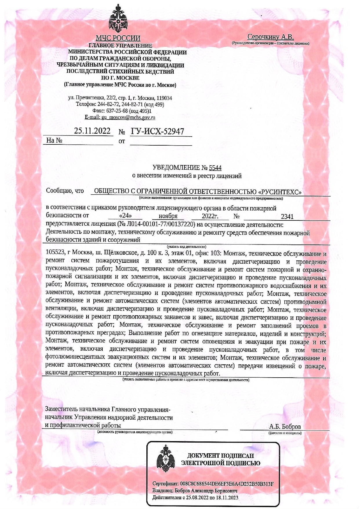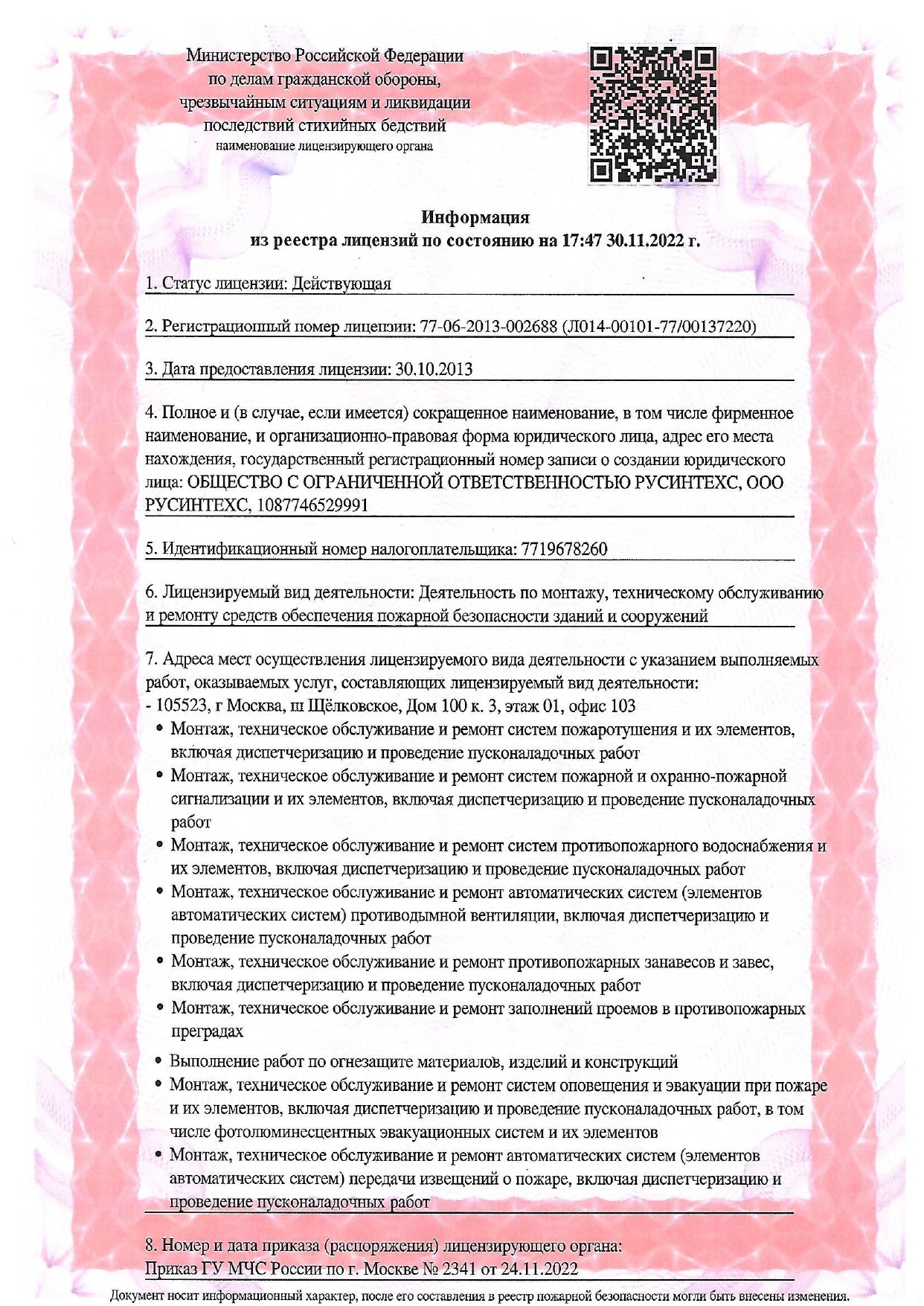 ПАО Ростелеком;Разработка рабочей документации, поставка оборудования, монтаж-наладка систем противопожарной защиты;Выполнены работы по поставке, монтажу-наладке систем противопожарной защиты арктического кластерного центра обработки данных ПАО Ростелеком по адресу: г.Мурманск, Кольский проспект, д. 188;2022;